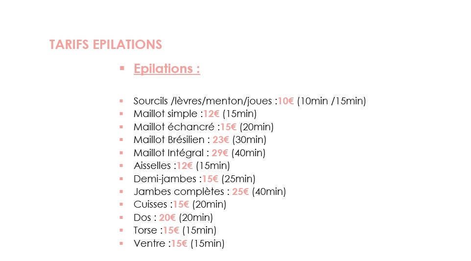 Je vous recommande d’arriver 10 minutes avant votre rendez-vous pour vous détendre et vous préparer.
